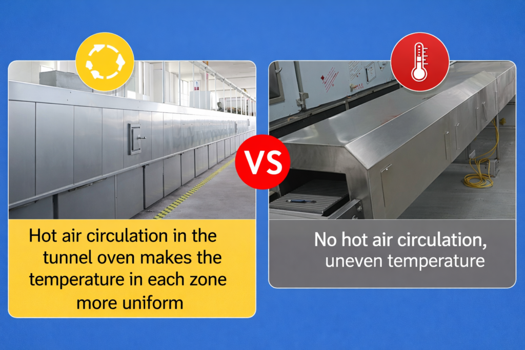Tunnel ovens with hot air circulation ensure even temperature distribution across all baking zones, resulting in consistent product quality. Without hot air circulation, temperature variations can lead to uneven baking and reduced output efficiency.