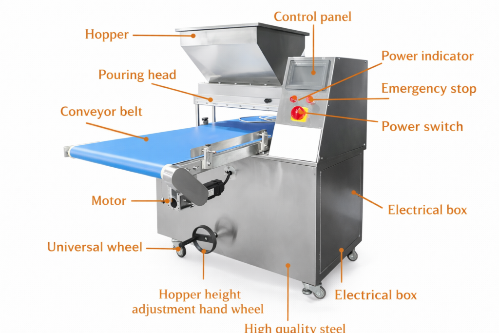 Its large-capacity hopper and precision pouring head ensure consistent batter distribution across the conveyor belt, making it ideal for mass production of cake rolls with uniform thickness and quality. The hopper height adjustment wheel offers flexibility for various recipe requirements.