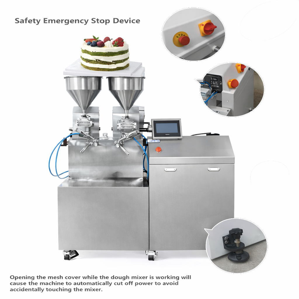 The integrated PLC touchscreen provides intuitive control over dispensing settings, while the rotating tray and sliding rails offer flexibility for different cake sizes and decorating styles. Operators can easily adjust functions with minimal training.