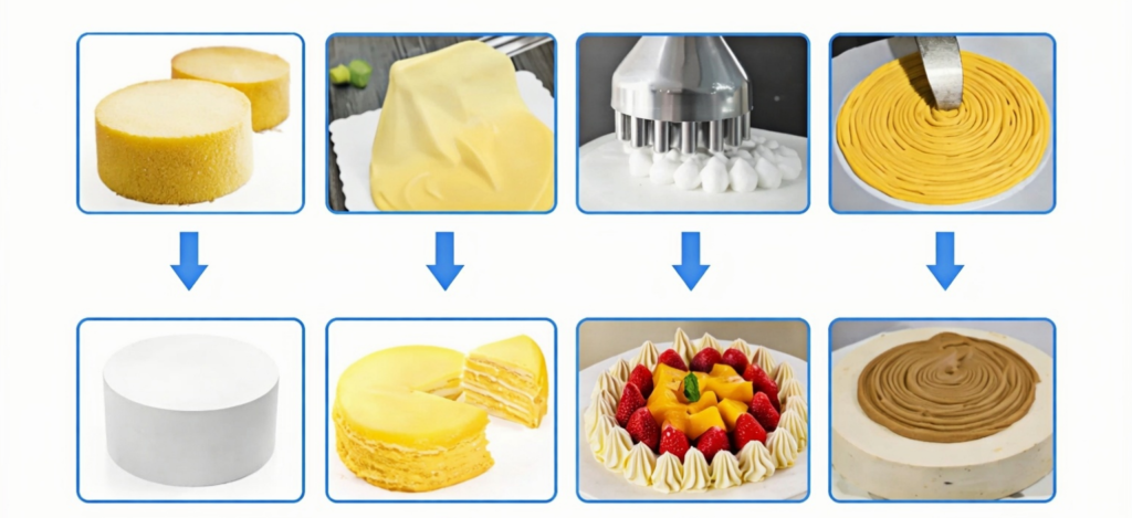 From round cakes to layered desserts and sponge bases, the machine handles each product with care and accuracy. Operators can easily switch between functions such as cream spreading, filling injection, and decorative piping, making it a versatile solution for bakeries seeking to scale production without compromising presentation standards.