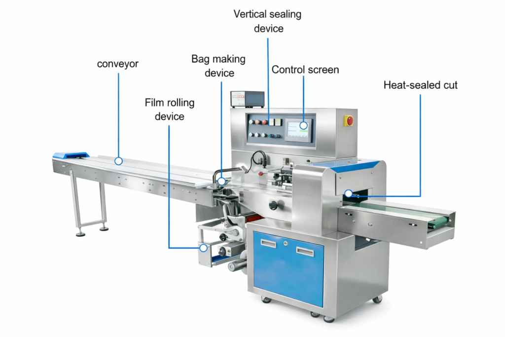 This machine integrates film feeding, bag forming, sealing, and cutting into one streamlined process—perfect for high-speed and continuous packaging operations.Smart Control System